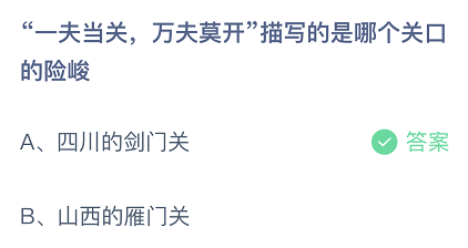 “—夫当关,万夫莫开”描写的是哪个关口的险峻?这是今日的蚂蚁庄园小课堂的问题,很多玩家都比较关注这个话题,接下来就让小编为大家详细介绍一下,希望可以帮助到大家。