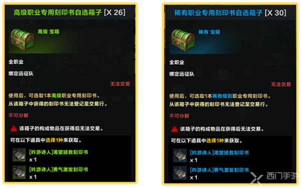 5、玩家完成主线任务,支线任务,指引任务可获取刻印书自选袋子,大部分为绑定,仅可用作自身,不可售卖,小部分是支持出售的。
