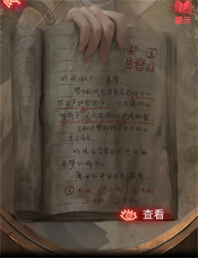 3.得到糖瓜,将糖瓜放在贡台上,将煤炭放入灶台,用引火棒点燃,将湿日记本放上得到反字日记本,对着镜子使用得到提示;如图7,打开柜子得到钥匙,打开门,得到煤油灯;