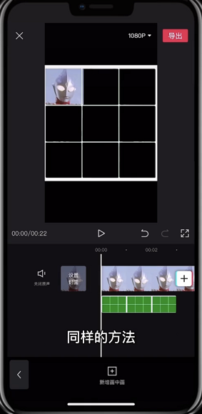 3.然后选择下面的色度抠图,加强强度去除绿幕,然后调整大小和位置把图片放在其中一个格子内;