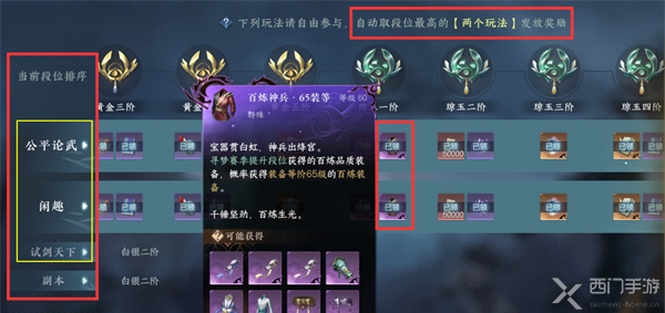 5、段位奖励--琼玉1阶--2件随机百炼装备--推荐33和闲趣玩法,快一些第一周就可以领取两件百炼装备啦;