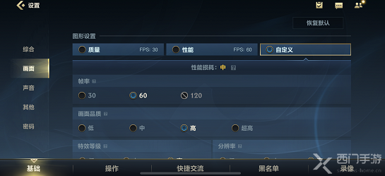 3、点击自定义,然后就可以看到高帧率的开启,符合高帧率的安卓机型可以开启90帧,符合的苹果机型可以开启120帧(下图是不符合的)。