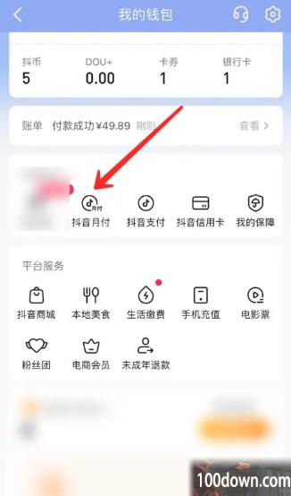2、进入我的钱包之后,上方位置会有一个【抖音月付】的功能,用户点击;