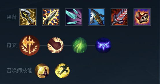 1.装备:无尽之刃+斯塔缇克电刃+纳沃利迅刃+赛瑞尔达的怨恨+饮血剑+贪婪之靴