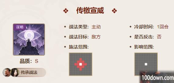 传檄宣威:对敌军单体造成17.8%~178%谋略伤害,并造成【缴械】,持续1回合。
