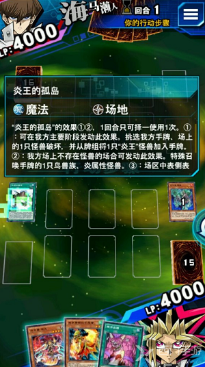 每一种怪兽效果都是有特殊的发动机制的,玩家点击卡牌就可以看到发动条条件,如果玩家没有满足条件,那么怪兽效果是不能发动的,所以玩家在召唤怪兽之前,一定要先看好发动条件以及自己的手牌有哪些,下面以“炎王的孤岛”效果为例:
