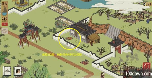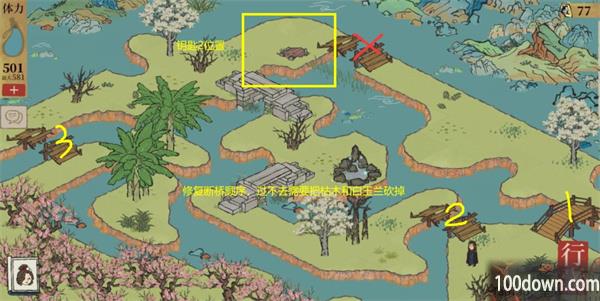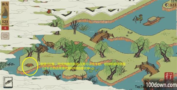 7、宝箱一:完成绣坊钥匙任务后往下滑,修复桥后即可领取,如果过不去需要把柳树和枯树砍掉;
