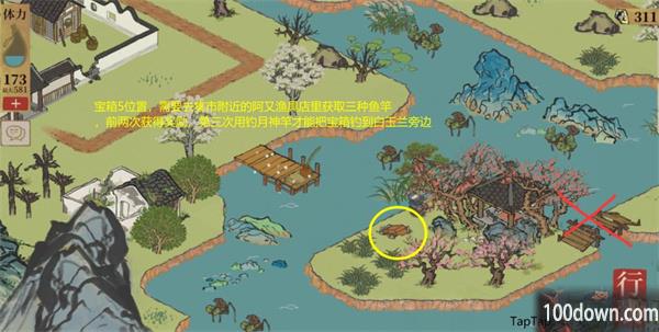 11、宝箱五:在湖中心的岛上可以找到,需要去集市附近的阿又渔具店获得三种鱼竿,第三次用钓月神竿才可以将宝箱钓到白玉兰旁边;