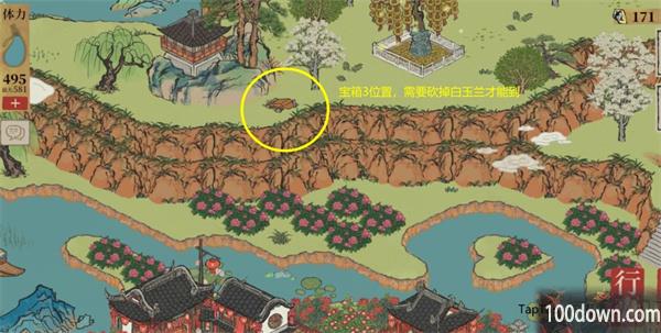 9、宝箱三:在爱心岛的左上方,砍掉白玉兰树才可以看到,位置如下图;