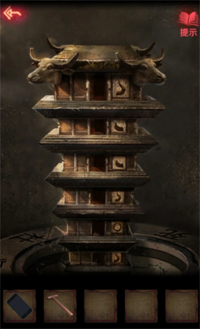 8.小木锤对着铜钟使用,顺序为1352543,得到泥叫叫,将木剑和泥叫叫放入碟子,打开手机,根据雕像指的交点14325,打开门。