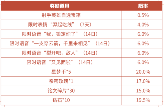 如果玩家没有购买后羿新皮肤,也可以在活动面板-活动-【无尽星芒】中,通过抽幸运好礼获取,其中“我,锁定你了”概率是6%,奖励获取概率表可以看下图: