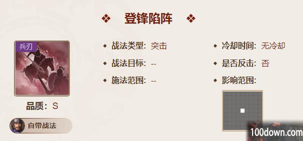 登锋陷阵:获得【先攻】:不会受到反击。【突击】对目标额外造成26%~52%兵刃伤害;对处于【孤立】状态的敌军,该额外伤害提升至52%~104%,且向前冲锋一格并击退敌军。