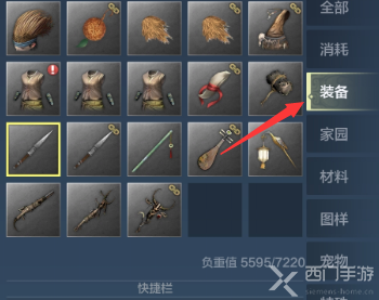 1.首先需要进入我们的武器背包,在里面可以看见各种的装备,点击右侧的装备栏;