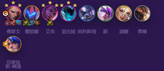 1、阵容成员:佛耶戈/厄斐琉斯、蕾欧娜、艾克、瑟庄妮、阿利斯塔、蔚、迦娜、泰隆