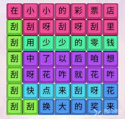 这是一个歌词连线的关卡,我们只需要在棋盘中,将正确的歌词进行连线即可通关,也可以根据下图每句歌词的颜色进行连线。
