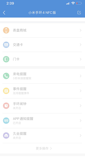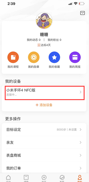 2、之后点击连接的小米手环就可以进入手环的设置功能界面;