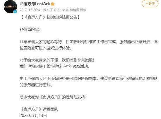 而本次维护已在7月13日晚8点40分已维护结束,官博发文,表示游戏的临时维护现已结束,“消气礼包”也将如约为大家送上。