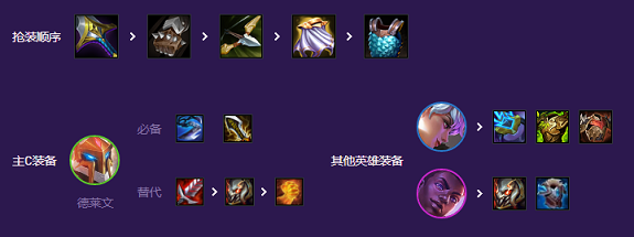 优先做好德莱文的三神装,最好的搭配是2输出装+1续航装,无尽+巨杀就是最暴力的选择,第三件最好是饮血剑保证续航,其次也可以选择正义之手、泰坦等。肉装一般给到三星瑞雯,离子火花、反甲、泰坦、狂徒、龙牙等一切肉装均可,如果后期瑞雯追不到三的话,可以将肉装分给艾克与瑟提。