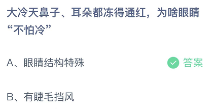大冷天鼻子、耳朵都冻得通红,为啥眼睛“不怕冷”?这是今日的蚂蚁庄园小课堂的问题,很多玩家都比较关注这个话题,接下来就让小编为大家详细介绍一下,希望可以帮助到大家。