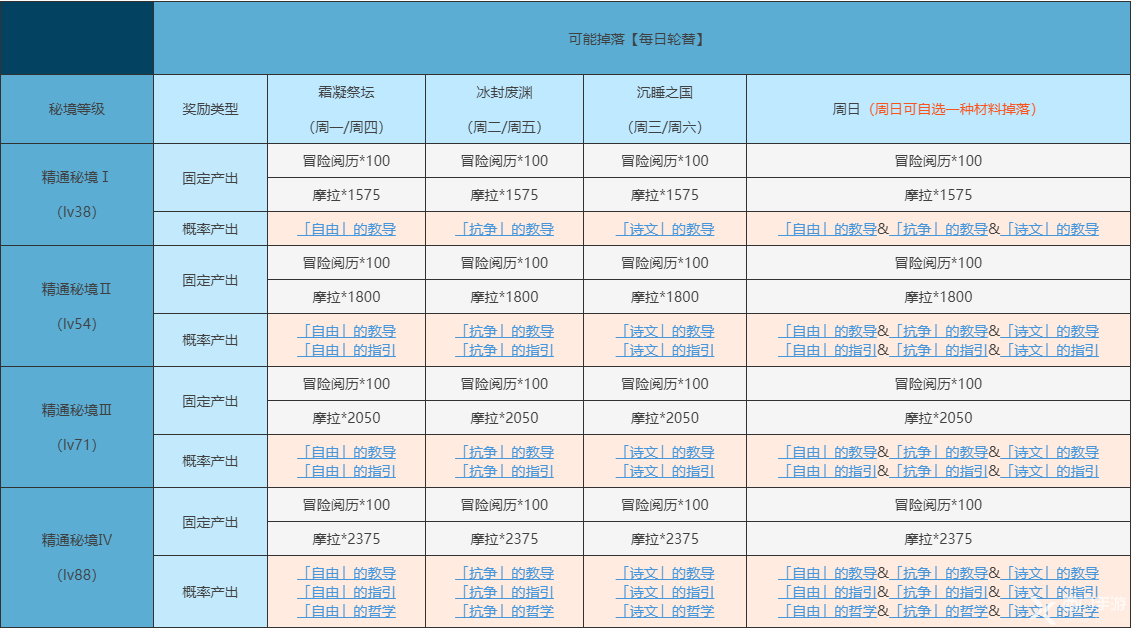 周一、周四、周日去攻打忘却之峡副本即可有几率掉落自由的指引素材,在忘却之峡秘境中会遇到冰史莱姆、大型冰史莱姆以及冰深渊法师等怪物,丰富的游戏奖励等待玩家在游戏中获取。