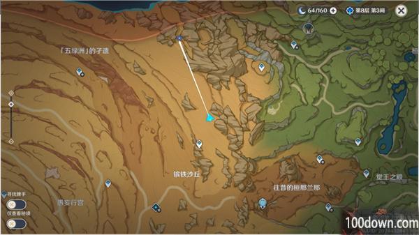 4、调查后前往信件中的密会地点,传送镔铁沙丘图中锚点,往地图的东北方向走,前往图中指引位置;
