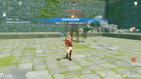 利用宵宫的普通攻击短时间内连续命中敌人,命中次数增加时,冲击波升级为超级冲击波,原地普通攻击即可,会持续回血,挑战中,所有角色持续恢复生命值。