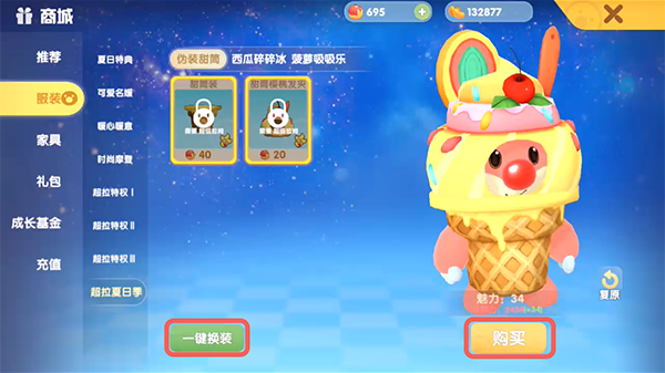 3.然后切换到【服装】,点击切换到【超拉夏日季】,选择伪装甜筒下方的【一键换装】;