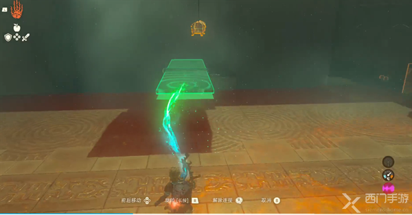 第六步:先使用究极手拉动石球,使其摇晃起来,当球摆向平台时,用弓箭射断绳索。