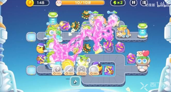 2、玩家使用多重箭先清理右侧的道具,然后在下方放两个电磁炮,升级;