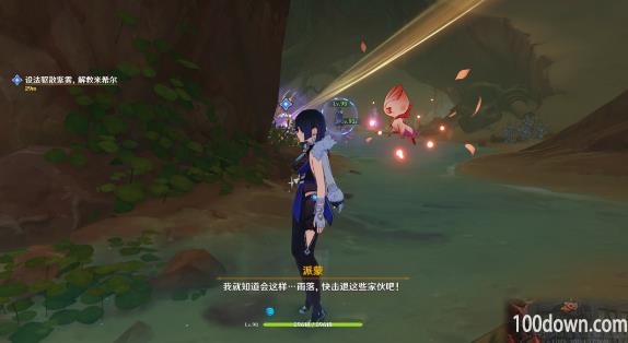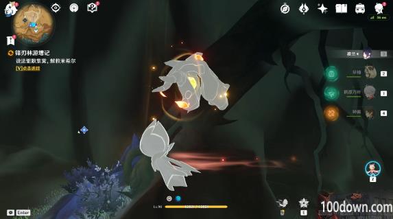 4、开启挑战后,保持「斯露莎」模式,视角往右边看,能看到「苦离果」,过去短按E交互一下(找不到可以用元素视野查看,能看到是白色的)