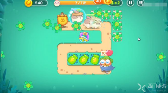 2、这些道具记得要升级,在中间靠出口的位置可以反复跑炮塔减慢兔子速度;