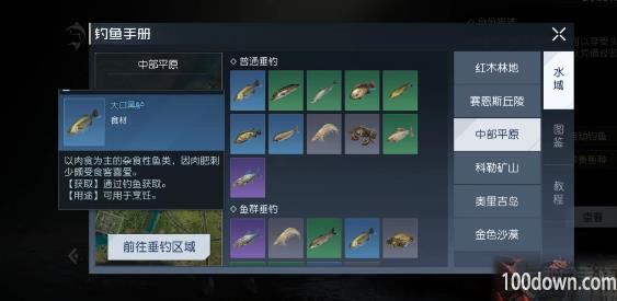 2、在钓鱼手册的中部平原、科勒矿山、金色沙漠中找到大口黑鲈,然后点击左下角的【前往垂钓区域】;