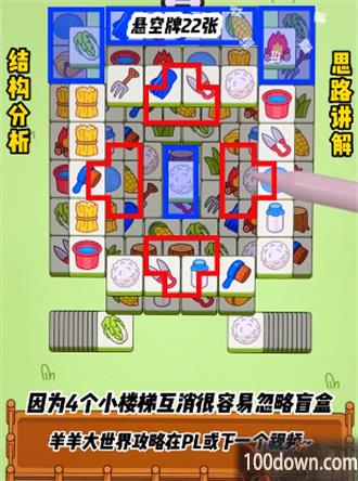 今天的悬空牌主要是在上面的四个区域,一共是22张,特别注意的是中间的三张不要直接去拿,中间的三张牌也是悬空的,拿了很容易导致失败,楼梯是四个三角形的楼梯,基本通过结构就知道今天的羊可以轻松拿到手了,下面就让我们一起来看下详细攻略。