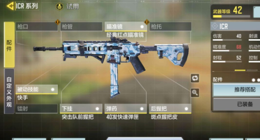 ICR这把枪射速快,伤害可观,获取难度很低,而且超级稳定,这个配件搭配有不到1秒的换弹时间,续航效果是非常好的,但是在精准度方面就有一些不足了。