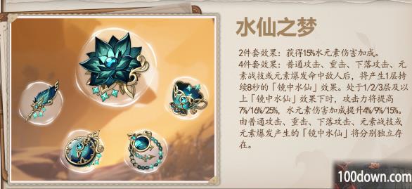 水仙之梦2件套效果是15%的水伤加成,适配输出型水系角色,作为2+2的散件也是一个不错的选择。