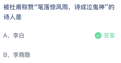 被杜甫称赞“笔落惊风雨,诗成泣鬼神”的诗人是?这是今日的蚂蚁庄园小课堂的问题,很多玩家都比较关注这个话题,接下来就让小编为大家详细介绍一下,希望可以帮助到大家。