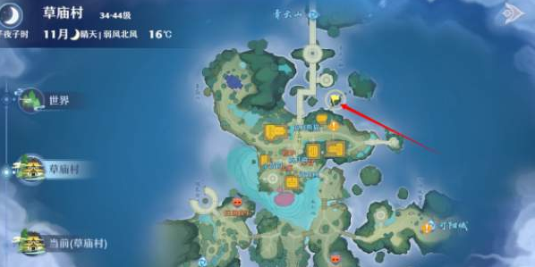 1.首先玩家要来到草庙村上方右侧的位置,如下图中标记位置;