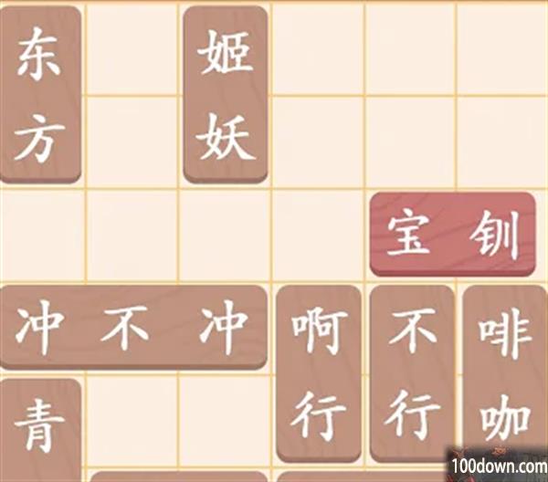 2、妖姬二字往上移动一格,不行二字往下移动一格,咖啡二字往下移动一格,宝钗二字一直往右移动,到达出口即可通关。
