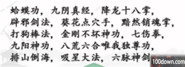 绝世武功答案:蛤蟆功、九阴真经、降龙十八掌、辟邪剑法、葵花点穴手、黯然销魂掌、打狗棒法、金刚不坏神功、七伤拳、九阳神功、八荒六合唯我独尊功、排山倒海、吸星大法、六脉神剑。