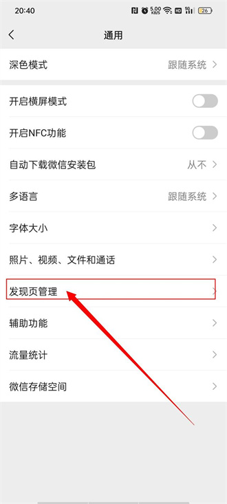 3、在【通用】选项里,找到并点击【发现页管理】。