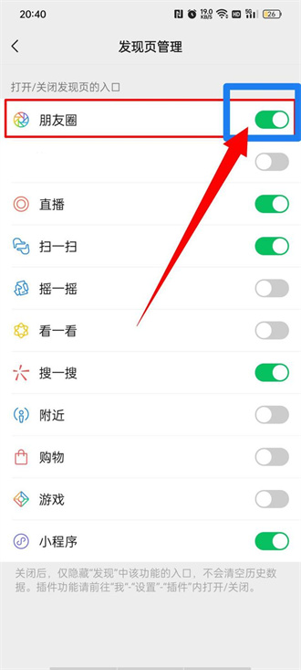 4、在新的页面里找到【朋友圈】这一选项,滑动关闭即可关闭朋友圈。