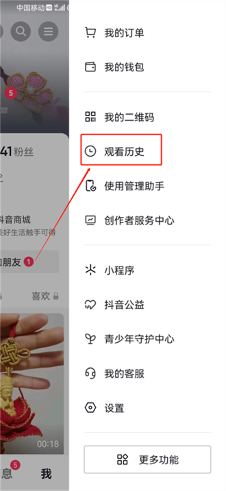 3、点击图标后,会出现很多页面选项,用户需要找到【观看历史】这个选项。