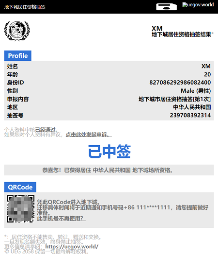 4、然后就会生成一个地下城居住资格抽签结果页面,和电影中的页面非常相似。