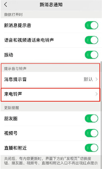 4、在【新消息通知】页面里,打开【来电铃声】这一个选项。
