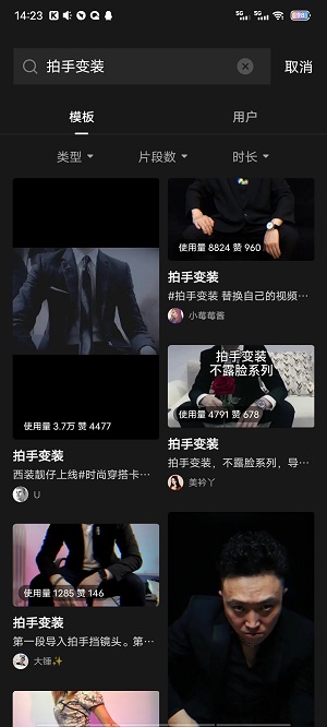 3.然后在剪同款界面上方的输入框内输入【拍手变装】进行搜索,搜索后会出现许多的拍手变装模板;