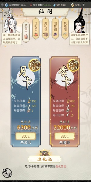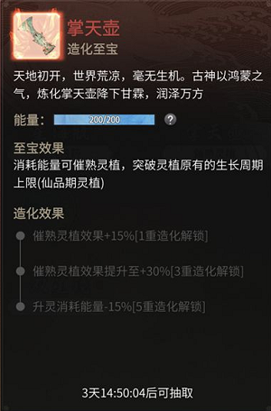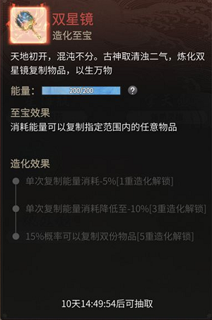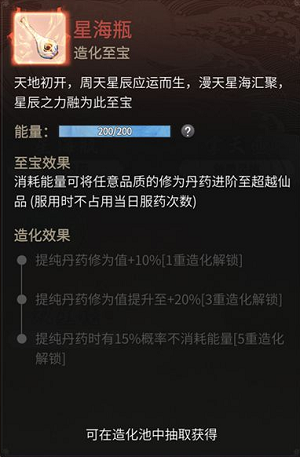 2.每抽取一次会获得10点造化值,每充1元可以增加1点造化值,当造化值满5000值即可直接获取造化至宝。