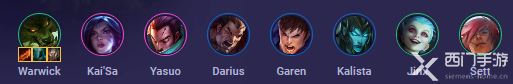 1、阵容成员:狼人+卡莎+亚索+诺手+盖伦+卡莉斯塔+金克丝+腕豪