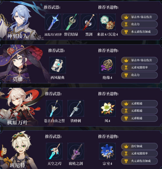 缺点是占用2个TO辅助+1个T0.5辅助,同时万叶和班尼特有一定充能压力,在打部分单体BOSS(如雷神)时可能会陷入大招充能不够的窘境。