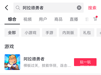 2、点击抖音app右上角位置的搜索选项,在搜索框中输入【阿拉德勇者】进行搜索,搜索后即可出现对应小游戏,点击玩一玩;