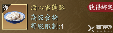 这也是一道暴击产物,暴击率为2%,玩家在制作【雪莲酥饼】的时候有几率获得【酒心雪莲酥】,雪莲酥饼的食谱是:雪莲花瓣+面粉+料酒+香料。